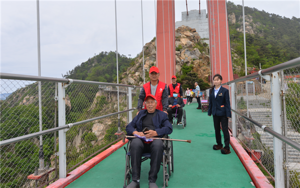 在費縣天蒙山景區(qū),黨員志愿者陪同殘疾人朋友乘坐索道、途經無障礙游步道到達了海拔近千米的世界第一人行玻璃懸索橋,和其他游客一同登山賞景,幫助他們實現無障礙旅游的夙愿。隨后,在《沂蒙山小調》誕生地,大家參觀展館,唱響沂蒙紅歌,追憶崢嶸往昔,緬懷革命先烈,開展了一堂生動的黨史教育課。