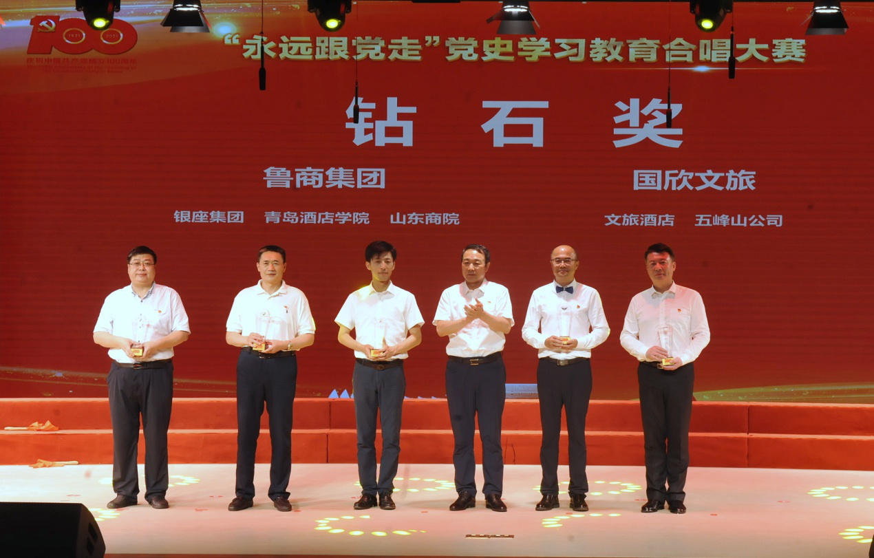 在隨后舉行的“永遠(yuǎn)跟黨走”黨史學(xué)習(xí)教育合唱大賽總決賽環(huán)節(jié),晉級(jí)決賽的4支參賽隊(duì)伍為現(xiàn)場觀眾帶來了一場精彩絕倫的視聽盛宴。經(jīng)過激烈角逐,最終山東文旅酒店集團(tuán)、五峰山公司獲得“鉆石獎(jiǎng)”,鄉(xiāng)發(fā)展集團(tuán)、山東文旅投資集團(tuán)獲得“金獎(jiǎng)”。參與此前大合唱預(yù)賽的山東文旅景區(qū)集團(tuán)、青島高爾夫公司、山東文旅傳媒集團(tuán)、省旅游設(shè)計(jì)院獲得“銀獎(jiǎng)”。