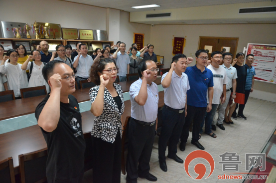 兩個(gè)支部的黨員們首先參觀(guān)了位于省圖書(shū)館一樓大廳的“紅色印記——黨史黨建文獻(xiàn)展”,一幅幅珍貴的歷史圖片和詳細(xì)的文字介紹記錄了1921年至1923年中國(guó)共產(chǎn)黨的創(chuàng)建歷史、光輝歷程。在黨員活動(dòng)室,魯商傳媒集團(tuán)黨委委員、副總經(jīng)理兼魯網(wǎng)總經(jīng)理、總編輯王法爭(zhēng)帶領(lǐng)兩個(gè)支部全體黨員莊嚴(yán)地舉起了右手,重溫入黨誓詞。