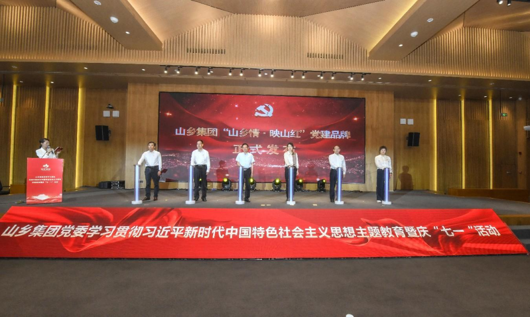 會上,與會領(lǐng)導(dǎo)共同上臺發(fā)布山鄉(xiāng)集團(tuán)“山鄉(xiāng)情·映山紅”黨建品牌。