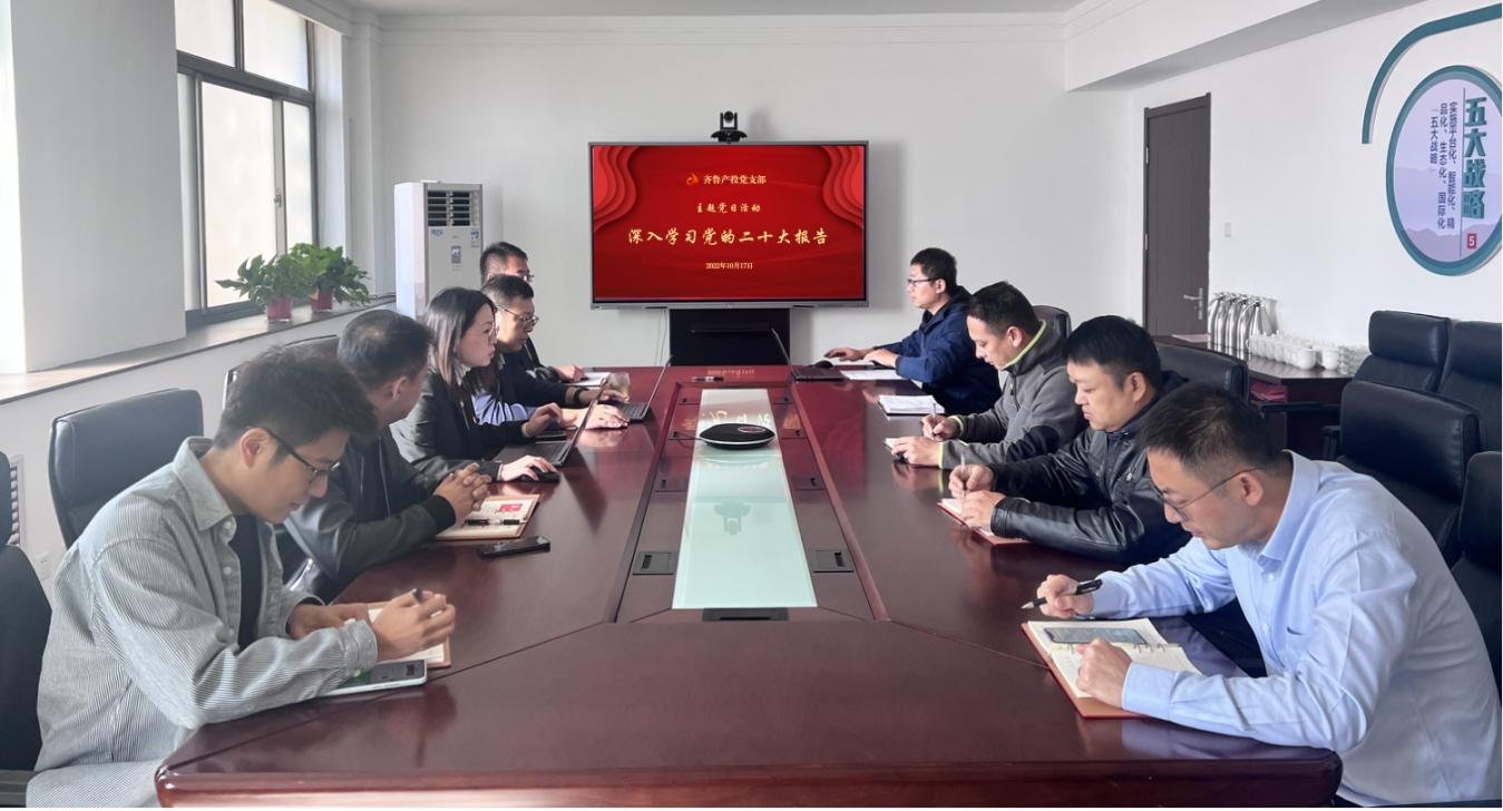 為深入學(xué)習(xí)貫徹落實(shí)黨的二十大報(bào)告精神,全面準(zhǔn)確地把握?qǐng)?bào)告豐富內(nèi)涵、精髓要義、精神實(shí)質(zhì),10月17日,齊魯產(chǎn)投黨支部組織開展“深入學(xué)習(xí)黨的二十大報(bào)告”主題黨日活動(dòng),黨支部書記、副總經(jīng)理?xiàng)钯F霞主持會(huì)議。