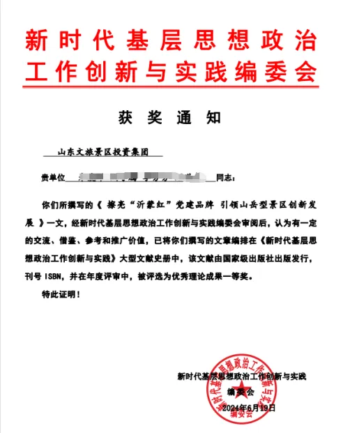 近日,山東文旅景區(qū)集團(tuán)黨委報(bào)送的黨建案例《擦亮“沂蒙紅”黨建品牌 引領(lǐng)山岳型景區(qū)創(chuàng)新發(fā)展》經(jīng)黨的基層建設(shè)與思想政治工作成果匯編委會(huì)審閱后,正式納入大型文獻(xiàn)史冊(cè)——《黨的基層建設(shè)與思想政治工作成果匯編》一書(shū)中,并在年度評(píng)審中被評(píng)為優(yōu)秀理論成果一等獎(jiǎng)。