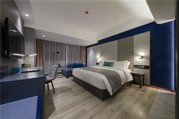 蘭歐酒店傾力于文化的經(jīng)營,創(chuàng)造新的經(jīng)營模式,如IP合作授權(quán)、藝術(shù)中心、主題IP客房、IP文創(chuàng)衍生品等。讓酒店不再是單純的住宿空間,而是可以承載文創(chuàng)、社交、商務(wù)、藝術(shù)聚合的多維空間。在酒店的整體造型上,采用現(xiàn)代設(shè)計(jì)元素,天然大理石紋理連接深色地毯,藍(lán)、灰、白三色營造的立體空間讓人行走舒適,視覺感受豐富。酒店大堂空間也一改過往的單調(diào)空洞,而是一個(gè)集藝術(shù)、時(shí)尚、閱讀、辦公、多元化交流、互動(dòng)及展示的空間,讓每位入住的旅客可以跨越歷史,徜徉在文化與藝術(shù)的海洋,聆聽文化心聲,感觸藝術(shù)氣息,在藝術(shù)中感悟住宿之愜意以及生活之美好。