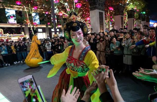 網(wǎng)紅互動(dòng)是本屆花燈會(huì)的亮點(diǎn),除了大唐不倒翁,還有變形金剛和仿真恐龍游行。大唐不倒翁小姐姐頭梳唐朝發(fā)簪,身著唐朝服飾,手持羅扇,略施粉黛,身姿輕盈,眼神婉轉(zhuǎn)動(dòng)人。仿真恐龍則是挖掘“科技炫酷 唯美歡樂(lè)”的新內(nèi)核,讓你感受濃濃的“機(jī)械風(fēng)”。