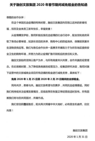 1月31日,融創(chuàng)文旅集團(tuán)發(fā)布公告稱(chēng),為降低商家經(jīng)營(yíng)壓力, 對(duì)旗下運(yùn)營(yíng)中的文旅城商業(yè)項(xiàng)目所有店鋪的租金進(jìn)行減免支持,免除2020年1月25日至2020年2月29日期間的全部租金。