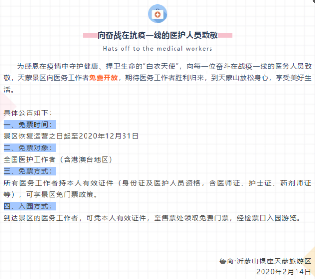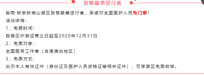 致敬逆行,感恩天使。為向奮戰(zhàn)在抗擊新冠肺炎疫情一線的醫(yī)務(wù)工作者致敬,2月14日,山東省文旅集團(tuán)與全國(guó)省級(jí)國(guó)有集團(tuán)聯(lián)盟共同發(fā)起“勝利后,讓我們重啟2020的美好”——致敬白衣戰(zhàn)士愛心公益活動(dòng),省文旅集團(tuán)旗下魯商·銀座天蒙旅游區(qū)、魯商·新泰新甫山景區(qū)率先發(fā)布公告,2020年內(nèi)向全國(guó)醫(yī)務(wù)工作者免費(fèi)開放,邀請(qǐng)他們?cè)趹?zhàn)勝疫情后到景區(qū)放松身心。