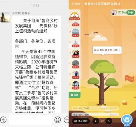 線上植樹,線下收獲。公司借助支付寶“螞蟻森林”線上公益平臺,發(fā)起合種了虛擬的“魯商鄉(xiāng)村發(fā)展集團(tuán)先鋒林”,動員全體黨員干部職工通過綠色出行、網(wǎng)絡(luò)購票、電子發(fā)票、綠色辦公、線上繳費(fèi)、綠色政務(wù)等日常低碳行為,收集、澆灌綠色能量,在手機(jī)上“澆水種樹”,助力先鋒林順利成長。之后螞蟻森林會在合適的時(shí)間,在線下以公司的名義,種下對應(yīng)能量數(shù)值的真樹,并發(fā)放電子合種證書。當(dāng)前,“手機(jī)種樹”不僅成為全社會“共同的事情”,還被認(rèn)可為公民法定植樹義務(wù)的盡責(zé)形式之一。