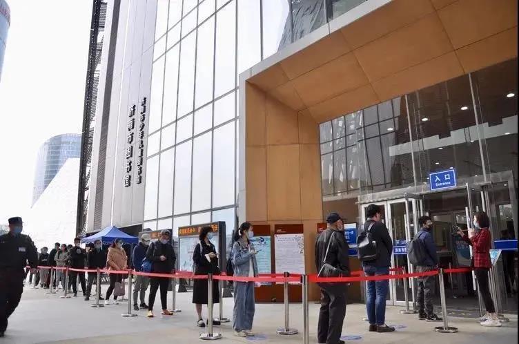 讀者在濟南市圖書館門口有序排隊,準備入館