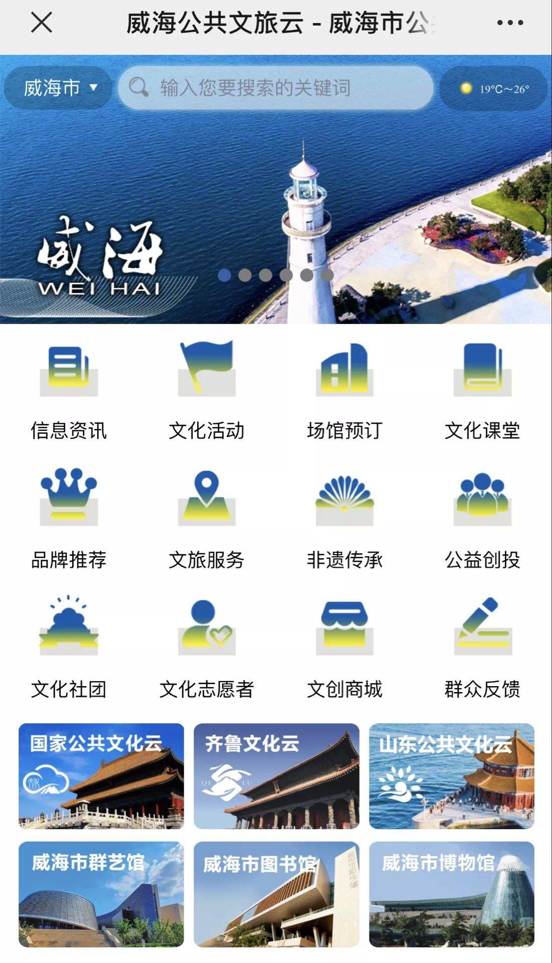 為深入貫徹落實(shí)黨的十九大關(guān)于“完善公共文化服務(wù)體系,深入實(shí)施文化惠民工程,豐富人民群眾文化生活”的指示精神,提升公共文化服務(wù)數(shù)字化網(wǎng)絡(luò)化建設(shè)水平,優(yōu)化平臺(tái)功能、創(chuàng)新服務(wù)方式、提高服務(wù)效能,按照第四批國(guó)家公共文化服務(wù)體系示范區(qū)創(chuàng)建標(biāo)準(zhǔn)的相關(guān)要求,我市建設(shè)了威海公共文旅云。