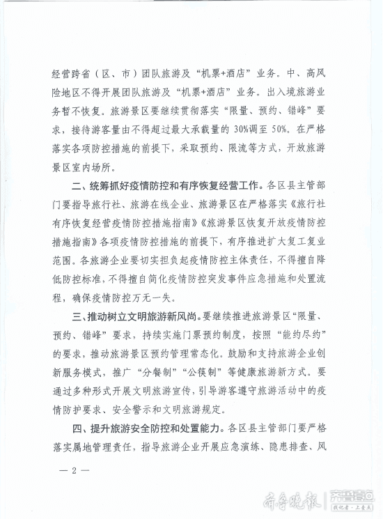 7月15日,濟(jì)南市文化和旅游局印發(fā)《關(guān)于轉(zhuǎn)發(fā)<文化和旅游部辦公廳關(guān)于推進(jìn)旅游企業(yè)擴(kuò)大復(fù)工復(fù)業(yè)有關(guān)事項的通知>的通知》,明確指出旅行社及在線旅游企業(yè)恢復(fù)經(jīng)營跨省(區(qū)、市)團(tuán)隊旅游及“機(jī)票+酒店"業(yè)務(wù),游客量由不得超過最大承載量的30%調(diào)至50%。