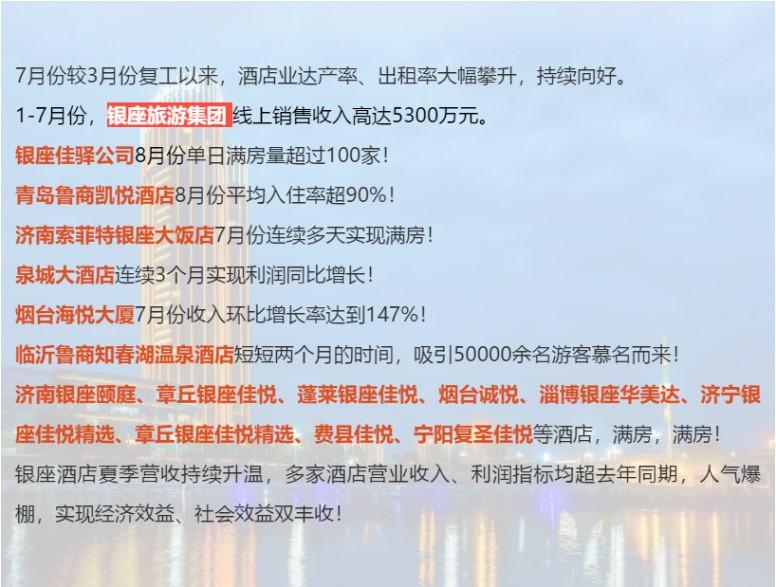 銀座酒店全線復(fù)蘇、提速加油,在這個(gè)盛夏摘得碩果!士氣高漲的奮斗者團(tuán)隊(duì)正積蓄能量,總攻秋冬,奮力沖擊全年目標(biāo)任務(wù)。下一步,銀座旅游集團(tuán)將繼續(xù)發(fā)揮專業(yè)酒店集團(tuán)優(yōu)勢(shì),以“締造全球旅客美好生活,打造酒店行業(yè)領(lǐng)先品牌”為目標(biāo),構(gòu)造“酒店+”、“+酒店”等多維度空間,用一流的產(chǎn)品和服務(wù),為賓客提供專業(yè)化、品質(zhì)化、全方位、有特色的高端現(xiàn)代時(shí)尚生活體驗(yàn),為行業(yè)高質(zhì)量發(fā)展注入新動(dòng)能。