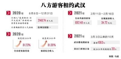 今年3月,隨著踏青賞花模式開啟,武漢再度因櫻花季成熱門目的地,春游市場人氣火爆。當(dāng)時(shí)間的腳步從2020年走到2021年,留下的一串串印跡在武漢寫就了文旅發(fā)展新篇章。