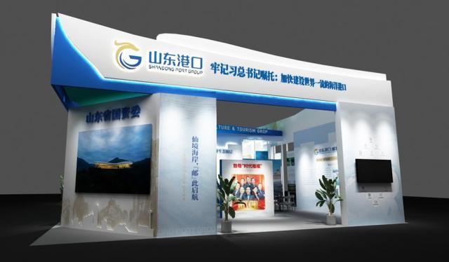 相較去年,今年山東省國資委展區(qū)設(shè)計整體色調(diào)采用了藍(lán)綠漸變,色彩靈感取自國欣文旅與山東港口兩大集團(tuán)的logo,漸變?nèi)诤蟿t體現(xiàn)了兩大集團(tuán)致力于文旅融合的工作方向。內(nèi)部整體設(shè)計風(fēng)格明快、簡約、樸素,同時通過背景與展板造型,著力表現(xiàn)城市與山水風(fēng)景的有機結(jié)合,實現(xiàn)“整體統(tǒng)一,重點突出”的展示效果。