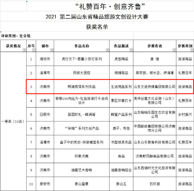 10月21日,“禮贊百年·創(chuàng)意齊魯 2021第二屆山東省精品旅游文創(chuàng)設計大賽”獲獎名單公布,山東文旅傳媒集團及旗下媒體選送的作品獲得三個獎項。
