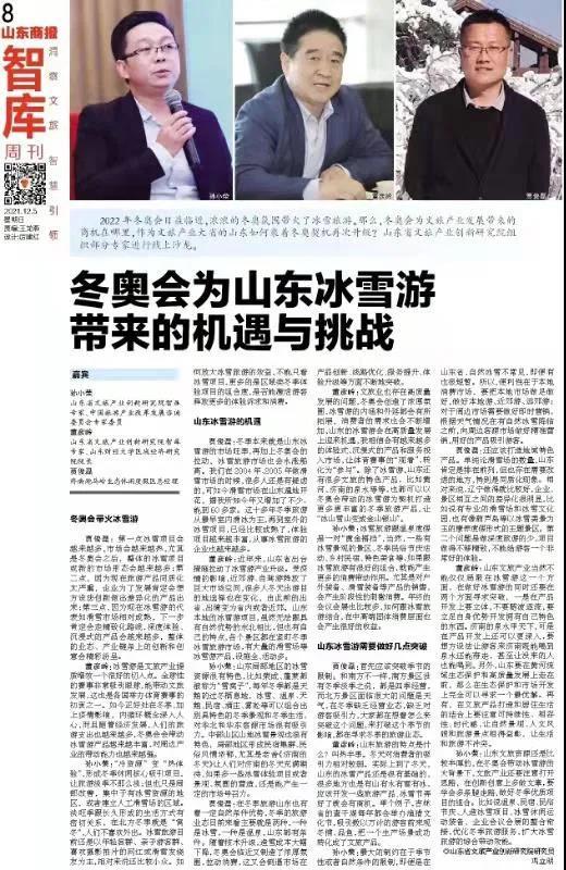 智庫版逢周日出版。首期關注了冬奧會話題和全域旅游概念。山東省文旅產(chǎn)業(yè)創(chuàng)新研究院智庫專家、中國旅游改革發(fā)展咨詢委員會專家委員孫小榮,山東省文旅產(chǎn)業(yè)創(chuàng)新研究院智庫專家、山東財經(jīng)大學區(qū)域經(jīng)濟研究院院長董彥嶺,濟南跑馬嶺生態(tài)休閑度假區(qū)總經(jīng)理賈俊磊等各抒己見,分析了冬奧會為山東冰雪游帶來的機遇和挑戰(zhàn)。