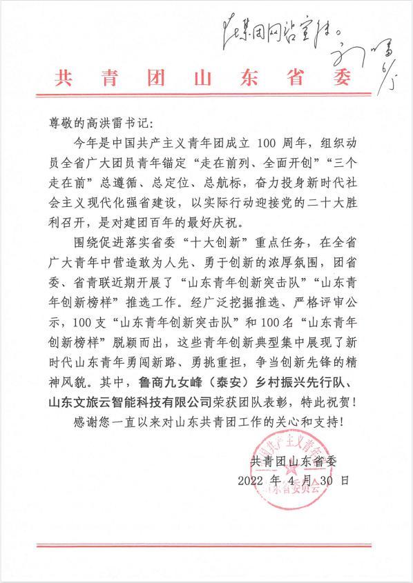 近日,山東文旅集團(tuán)黨委書記、董事長高洪雷收到團(tuán)省委發(fā)來的賀信,祝賀集團(tuán)直屬單位山鄉(xiāng)集團(tuán)九女峰(泰安)鄉(xiāng)村振興先行隊、山東文旅景區(qū)集團(tuán)山東文旅云智能科技有限公司在團(tuán)省委、省青聯(lián)開展的“山東青年創(chuàng)新突擊隊”推選工作中,經(jīng)過嚴(yán)格評審脫穎而出,獲“山東青年創(chuàng)新突擊隊”榮譽(yù)稱號。