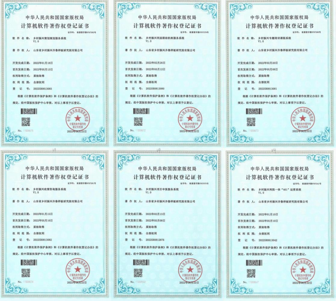 近日,山東省鄉(xiāng)村振興齊魯樣板研究院(簡稱“研究院”)《鄉(xiāng)村振興戰(zhàn)略系列叢書》《山東省鄉(xiāng)村振興齊魯樣板課程體系》獲得國家版權(quán)局頒發(fā)的著作權(quán)登記證書,《鄉(xiāng)村振興兩院一體“461”運營體系》《鄉(xiāng)村振興項目申報服務(wù)體系》《鄉(xiāng)村振興利益聯(lián)結(jié)機制服務(wù)體系》《鄉(xiāng)村振興策劃規(guī)劃服務(wù)體系》等6項研究成果獲得國家版權(quán)局頒發(fā)的計算機軟件著作權(quán)登記證書。