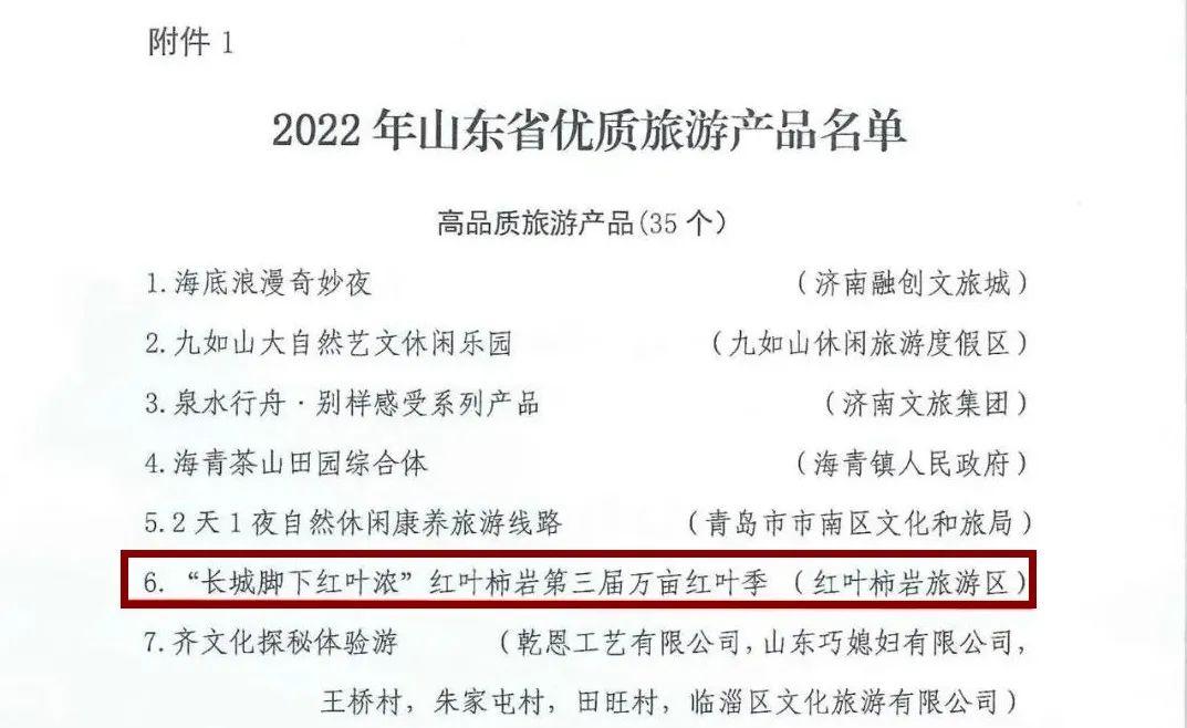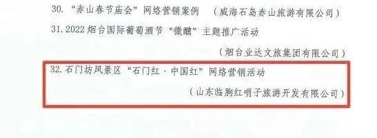 天蒙景區(qū)《沂蒙星火,小調(diào)情長》、紅葉柿巖旅游區(qū)“長城腳下紅葉濃”第三屆萬畝紅葉季入選2022年山東省優(yōu)質(zhì)旅游產(chǎn)品名單;石門坊景區(qū)“石門紅·中國紅”網(wǎng)絡(luò)營銷活動(dòng)入選2022年山東省文旅網(wǎng)絡(luò)營銷優(yōu)秀案例產(chǎn)品名單。