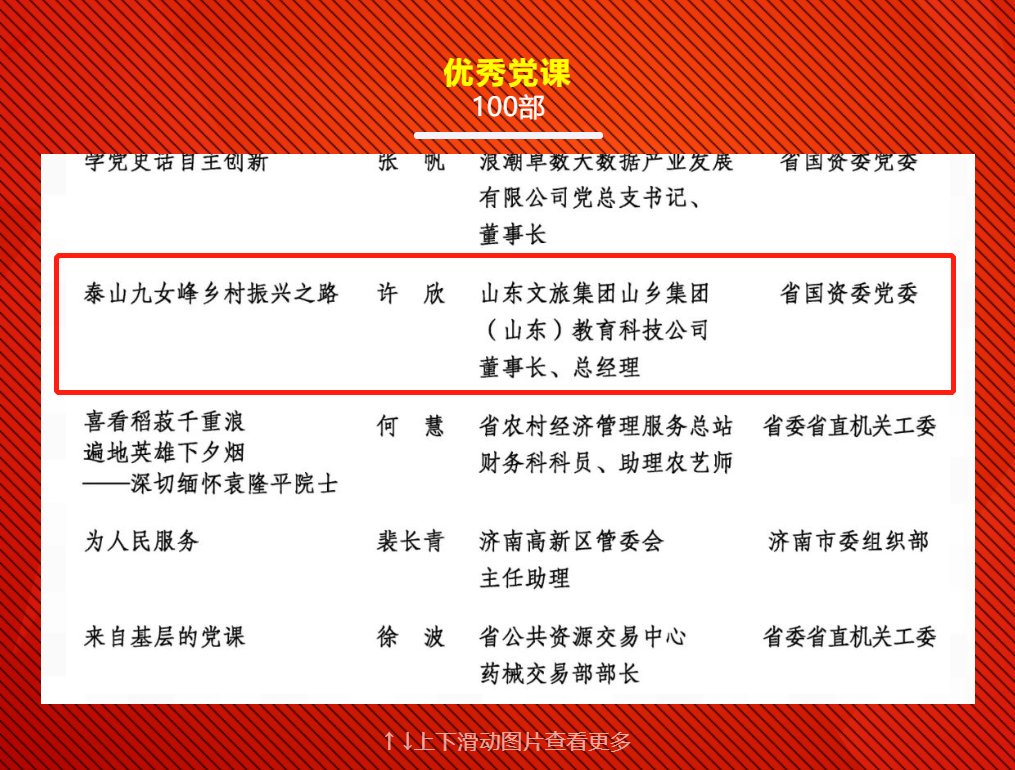 “腳下沾滿泥土,心中充滿熱愛”,山東文旅所屬山鄉(xiāng)集團(tuán)優(yōu)秀黨員許欣,飽含深情地開啟了《泰山九女峰鄉(xiāng)村振興之路》的講述,黨課作品共分為“守初心·黨建引領(lǐng)”“敢擔(dān)當(dāng)·振興藍(lán)圖”“促發(fā)展·產(chǎn)業(yè)賦能”“走在前·齊魯樣板”四個章節(jié),設(shè)計(jì)巧妙、內(nèi)容豐富,將山東文旅鄉(xiāng)村振興故事娓娓道來,全面展示了山東文旅人牢記囑托走在前、勇?lián)姑_新局的勇氣和毅力,用每一次行動、每一個成功經(jīng)驗(yàn)譜寫新時(shí)代文旅人的使命與擔(dān)當(dāng)。