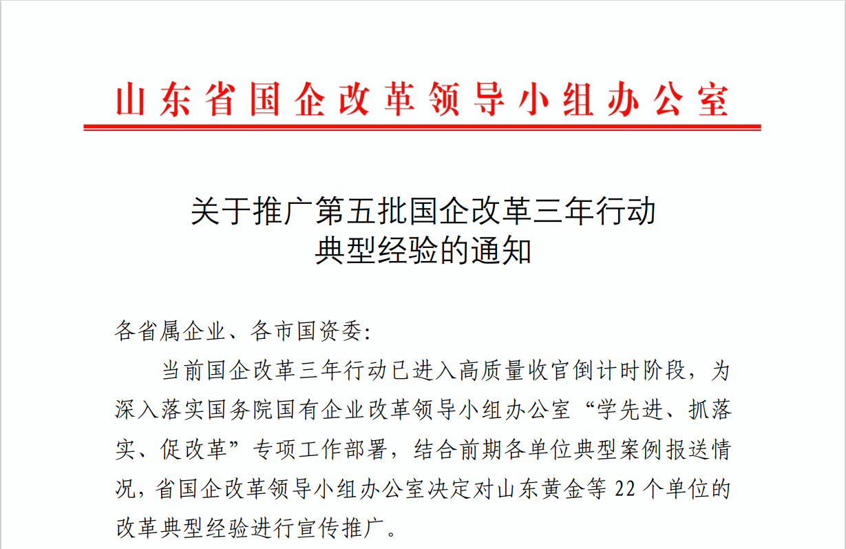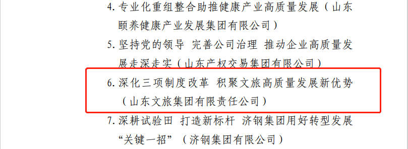 近日,山東省國(guó)企改革領(lǐng)導(dǎo)小組辦公室下發(fā)《關(guān)于推廣第五批國(guó)企改革三年行動(dòng)典型經(jīng)驗(yàn)的通知》,公布省屬企業(yè)改革典型案例推廣名單,山東文旅集團(tuán)報(bào)送的《深化三項(xiàng)制度改革 積聚文旅高質(zhì)量發(fā)展新優(yōu)勢(shì)》經(jīng)驗(yàn)案例榜上有名,為集團(tuán)“國(guó)企改革三年行動(dòng)”收官之年寫(xiě)下精彩的一筆。