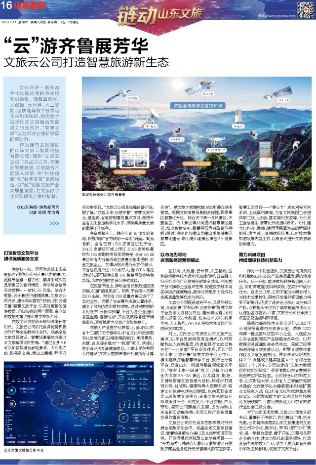 文旅云公司既是政府平臺(tái),又是科技公司,全面負(fù)責(zé)“好客山東云游齊魯”智慧文旅平臺(tái)及相關(guān)項(xiàng)目的開(kāi)發(fā)、建設(shè)和運(yùn)營(yíng),同時(shí)深入探索5G、大數(shù)據(jù)、北斗技術(shù)、GIS、數(shù)字孿生、人工智能、VR/AR等技術(shù)在文旅產(chǎn)業(yè)的研發(fā)和應(yīng)用。
