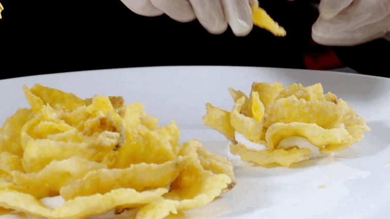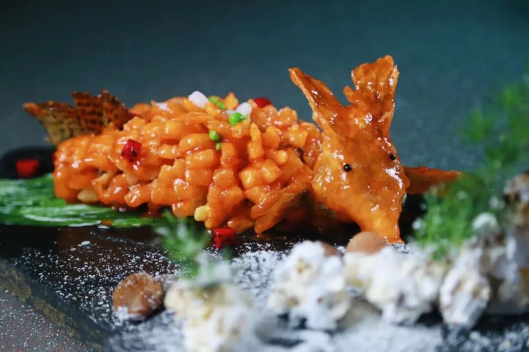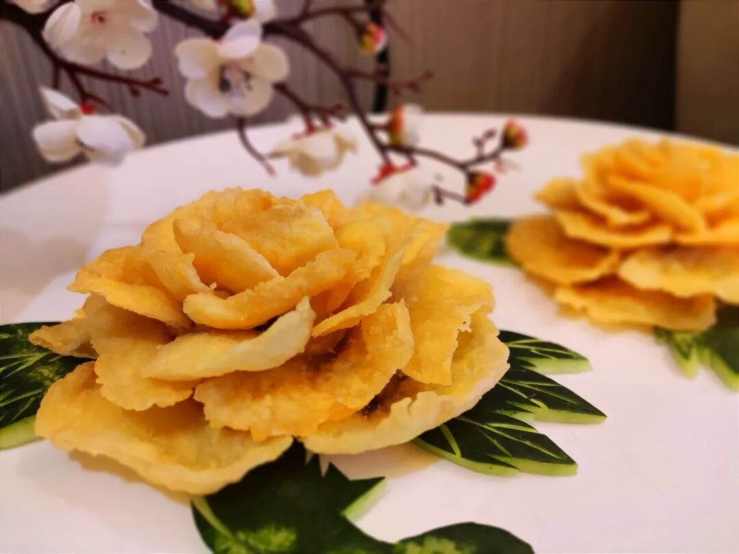 吃魚不見魚,既有花的模樣,又有著魚的鮮美,富貴金牡丹,顏值與口味兼俱。將每一片魚切成0.3厘米,經(jīng)過熱油烹炸后,既保持了花瓣的形狀,又保留了酥脆的口感。經(jīng)過廚師巧手的擺制,一朵朵盛開的牡丹躍然餐桌,再蘸上用牡丹花蕊蜂蜜調(diào)制的蘸汁,可謂是口感層層遞進(jìn),回味無窮。