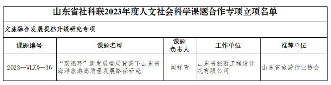 近日,山東省社科聯(lián)公布了2023年度人文社會科學(xué)課題合作專項立項名單,由山東文旅集團旗下省旅游設(shè)計院閆祥青、孫曉靜、李猛、于逢荷課題組申報的《“雙循環(huán)”新發(fā)展格局背景下山東省海洋旅游高質(zhì)量發(fā)展路徑研究》獲批立項,課題類別為“文旅融合發(fā)展提檔升級研究專項”,為本年度獲批立項單位中的唯一一家企業(yè)型研究機構(gòu)。