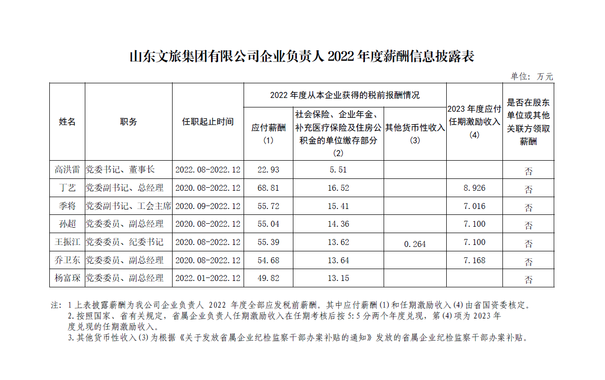 山東文旅集團(tuán)有限公司企業(yè)負(fù)責(zé)人2022年度薪酬信息披露表