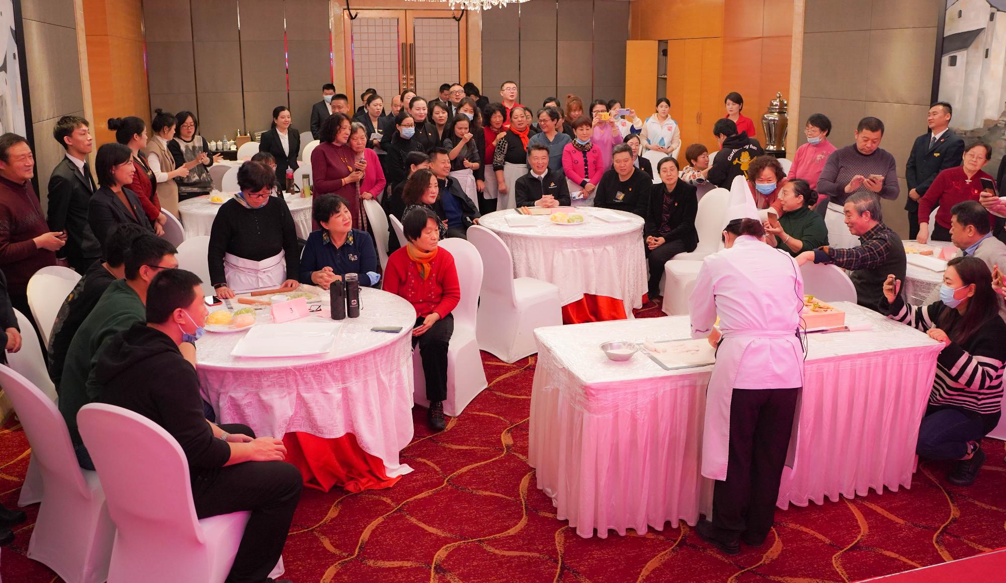活動現(xiàn)場,濟南索菲特銀座大飯店餅房廚師長梁敏現(xiàn)場教授花式水餃的包法,并介紹了冬至吃餃子的來歷?,F(xiàn)場參會人員分為7個小組包餃子并進行PK,評出了“最快餃子”團隊和“最美餃子”團隊。